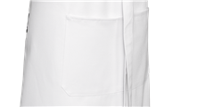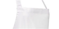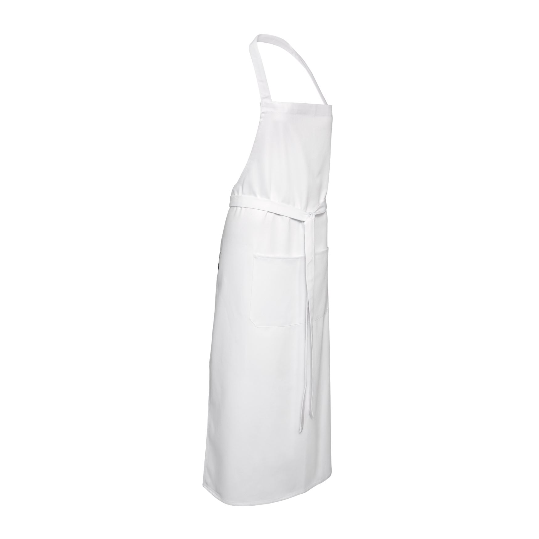 Latzschürze mit aufgesetzter Tasche rechts und Bändern.